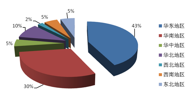 華東地區(qū)43% 華南地區(qū)30% 華北地區(qū)10% 華中地區(qū) 5%
