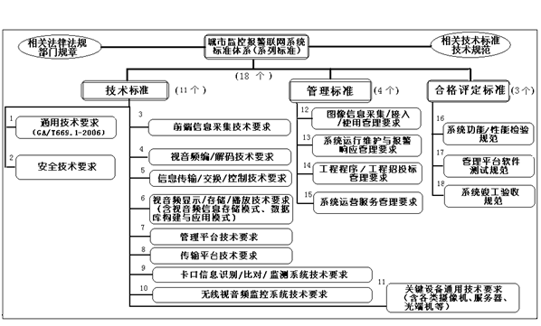 二、城市監(jiān)控報警聯(lián)網(wǎng)系統(tǒng)標準體系(共18項標準:技術(shù)標準11項、管理標準4項、合格評定標準3 項)