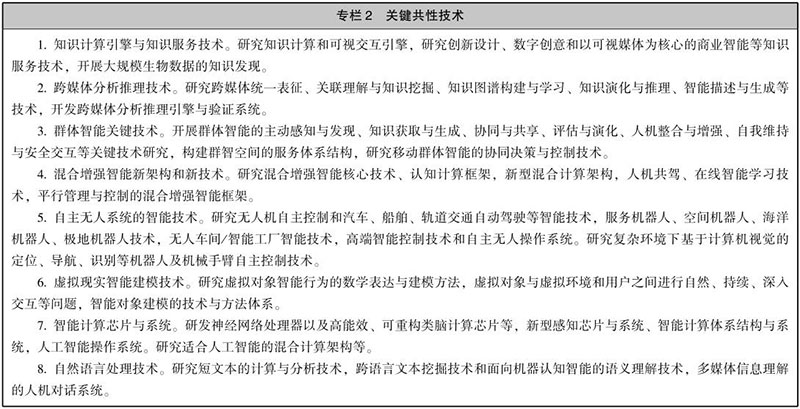 “1”是指新一代人工智能重大科技项目,聚焦基础理论和关键共性技术的前瞻布局,包括研究大数据智能、跨媒体感知计算、混合增强智能、群体智能、自主协同控制与决策等理论,研究知识计算引擎与知识服务技术、跨媒体分析推理技术、群体智能关键技术、混合增强智能新架构与新技术、自主无人控制技术等,开源共享人工智能基础理论和共性技术。持续开展人工智能发展的预测和研判,加强人工智能对经济社会综合影响及对策研究。
