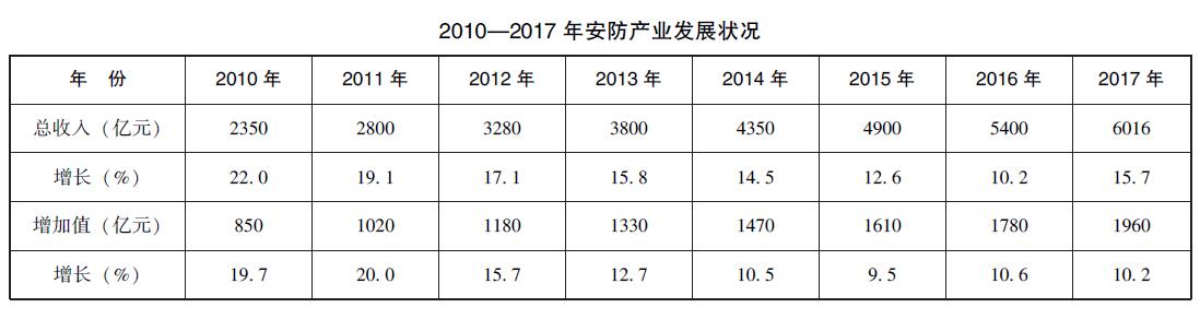 据不完全统计,截至2017年年底,中国安防企业约为3万家,从业人员达到160万人,安防企业年总收入达到6016亿元左右,年均增长15.7%;2017年全行业实现增加值1960亿元,年均增长12.7%。