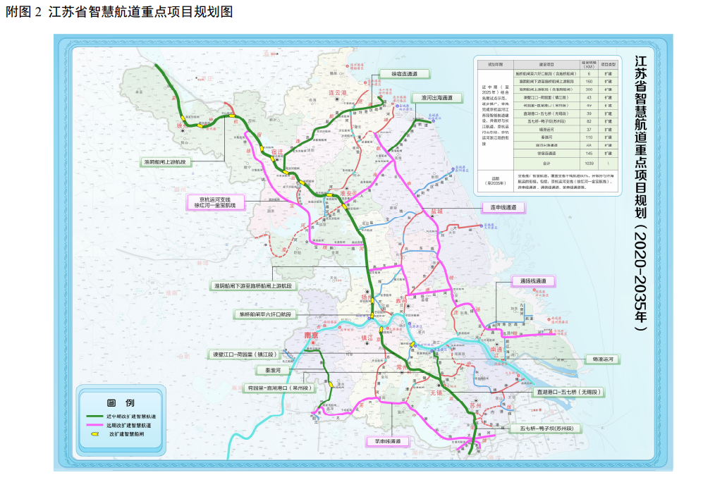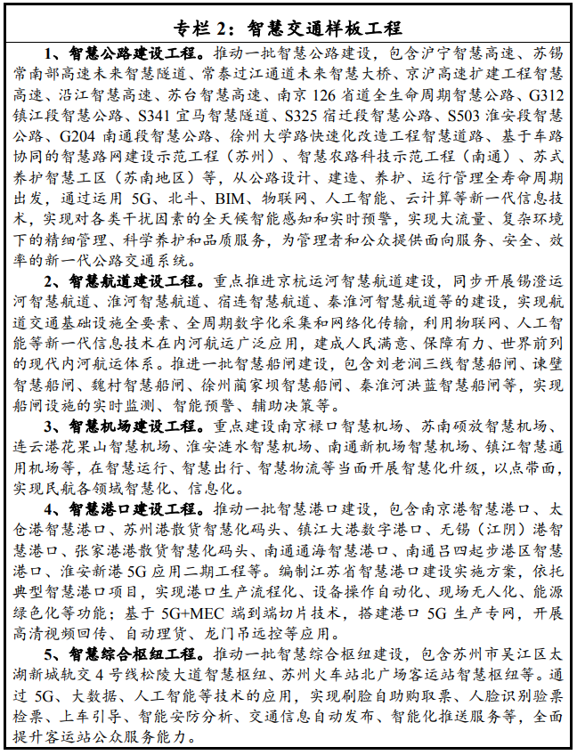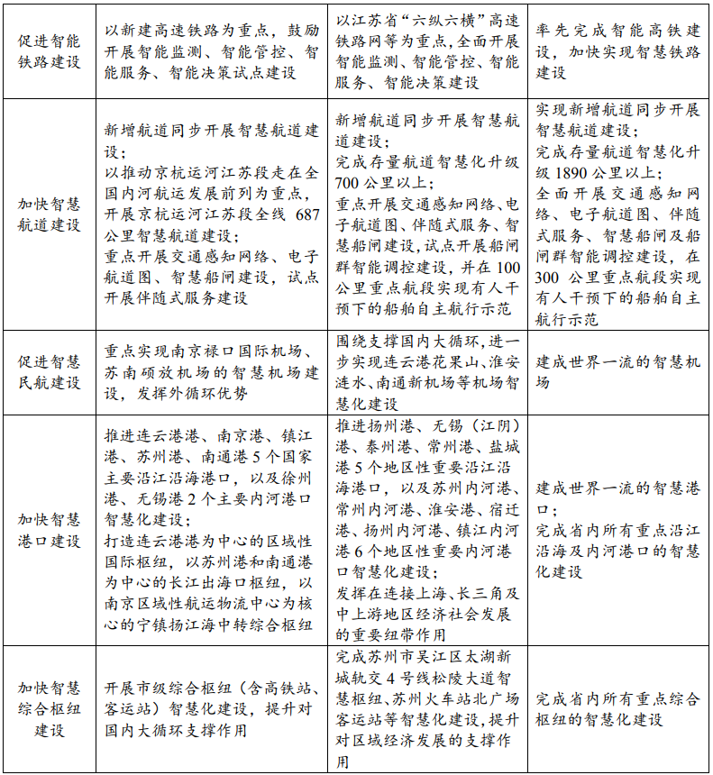 基础设施数字化。完成一批智慧公路、智能铁路、智慧航道、智慧民航、智慧港口和智慧综合枢纽等智慧交通基础设施建设。推动新建、改扩建高速公路和普通国省道公路同步开展智慧公路建设,实现“增量”提质升级,同时以沿江地区、苏南片区、南京都市圈等为重点,完成存量公路智慧化升级1200公里以上,实现“存量”挖潜增效,并在约200公里道路上实现车路协同。以推动京杭运河江苏段走在全国内河航运发展前列为重点,完成京杭运河江苏段全线智慧航道建设,存量航道智慧化升级达到700公里以上,并在重点航段实现有人干预下的船舶自主航行示范。
