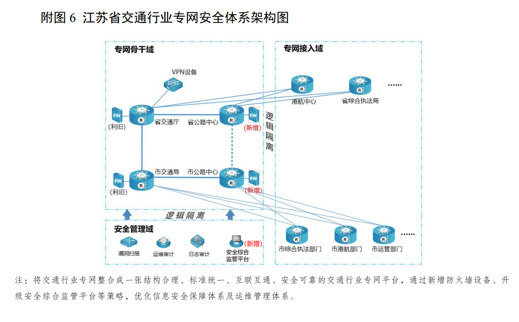 落实网络安全等级保护制度。加强网络信任、容灾备份、监控审计、监测防护、态势感知等体系的规划与建设,构建江苏省交通运输网络安全综合监管平台,提高交通运输关键信息基础设施、融合基础设施和重要信息系统的网络安全防护能力,推动部署灵活、功能自适、云网边端协同的新型基础设施内生安全体系建设。